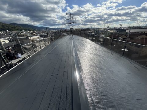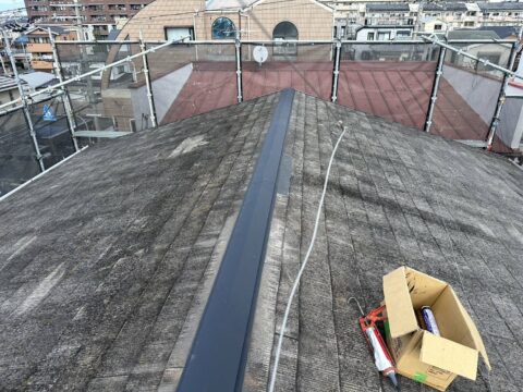こんにちわ。大阪狭山市を拠点に大阪府内で外壁塗装工事を施工しておりますハクユウシャです。ブログ閲覧ありがとうございます。昨日完了した物件で3階建て、屋根に上がる手段がない状況で、今回足場を組んだことで発見できた例です。特に入居者様からの雨漏りに対するクレームも無く、地上からは全く見えない場所で屋根の棟板金がビス止めしていたカラーベストごと6m程吹き飛んでいました。台風などがあった場合近くに高い建物が有れば見ることも出来るかもしれませんが中々3階建て以上で足場無しで確認することは困難かもしれません。写真は発見時の現況・下地木材後板金工事・カラーベストシーラー塗り・シリコン樹脂1回目・シリコン樹脂2回目完了時の写真です。