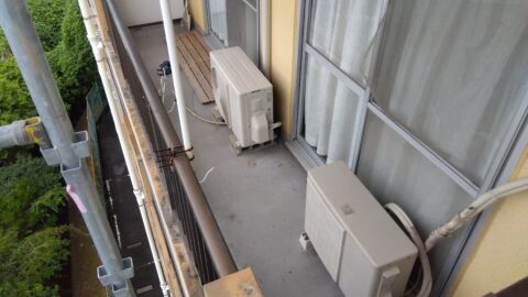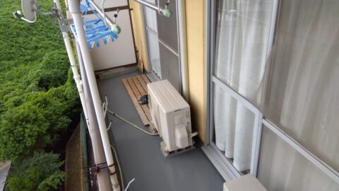 次の工事は、同じく9月前半に枚方のマンション7階建て5階(2部屋)の防水工事です。建物自体の劣化も激しく階下に水漏れの度に数部屋ずつ防水工事の依頼を頂いております。過去の大規模改修時の防水がボロボロにめくれている為、側溝の隙間から階下に水が漏れ洗濯物が干せないというものでした。まず既存塗膜(水性)の除去を行いプライマー・ウレタン防水・トップコートの順で作業します。今回足場を組んでいただけたので助かりました。ベランダの荷物を避けるスペースが無いのが改修工事の防水の難儀なところです。